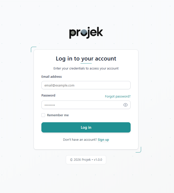 Login and password management ensure secure access to your Projek account and protect sensitive workspace data. After completing registration and email verification, users can access the platform using their registered credentials through the secure login interface.