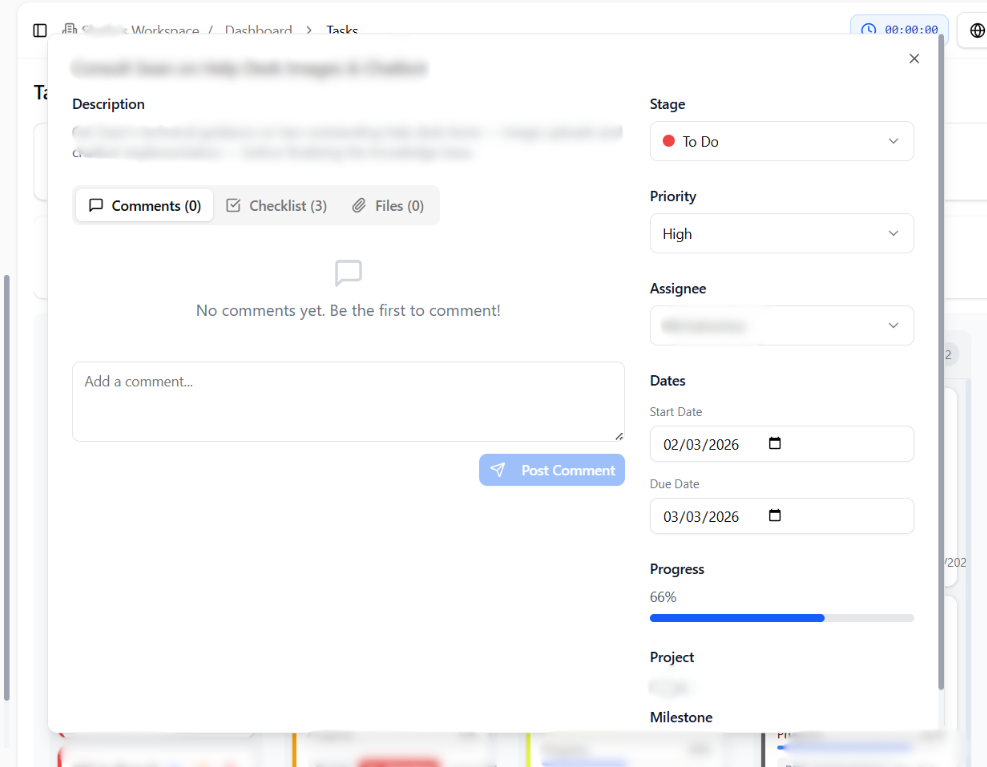 Each task includes a dedicated comment section where team members can: