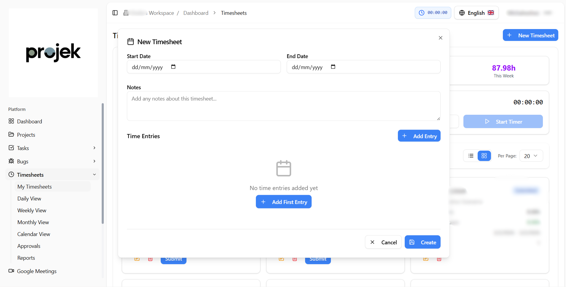 Projek provides flexible tools for recording work hours, allowing users to track time either through a live timer or manual entry. These options ensure accurate logging whether work is performed in real time or recorded after completion.
