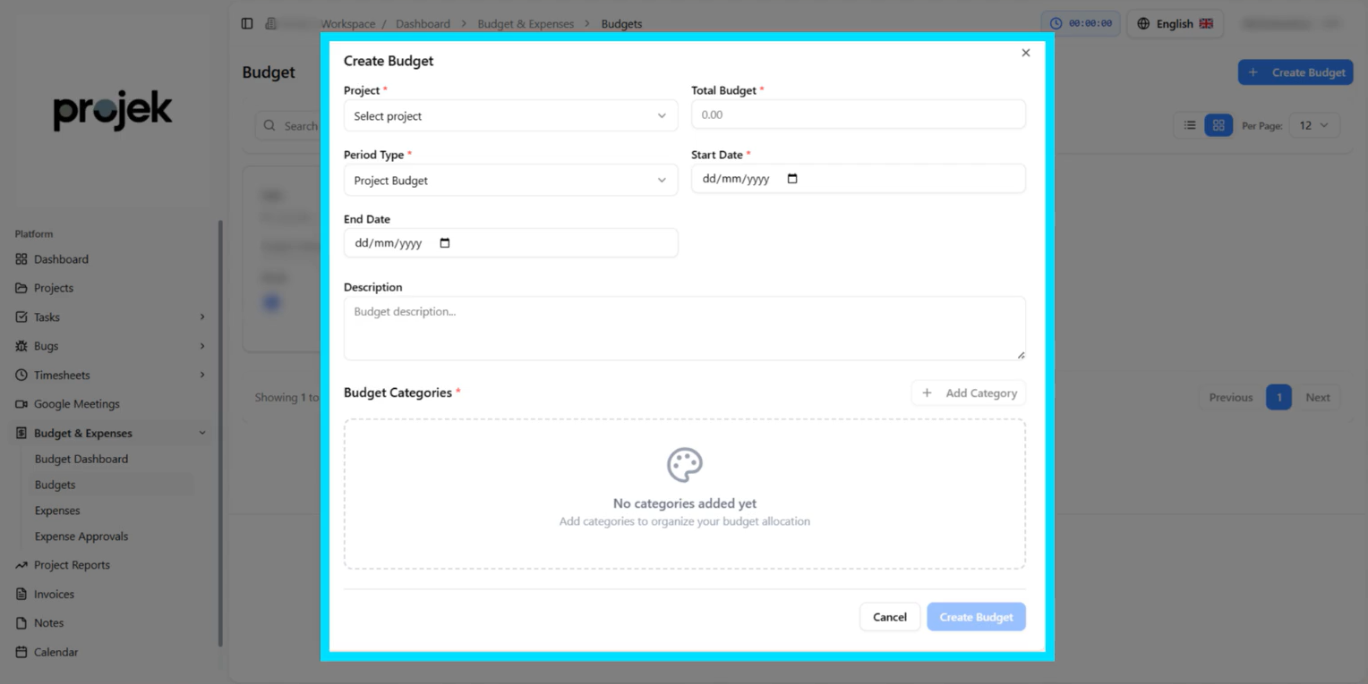 Creating a project budget in Projek allows teams to define financial boundaries before execution begins. Establishing a clear budget ensures that project costs remain controlled and aligned with business objectives.